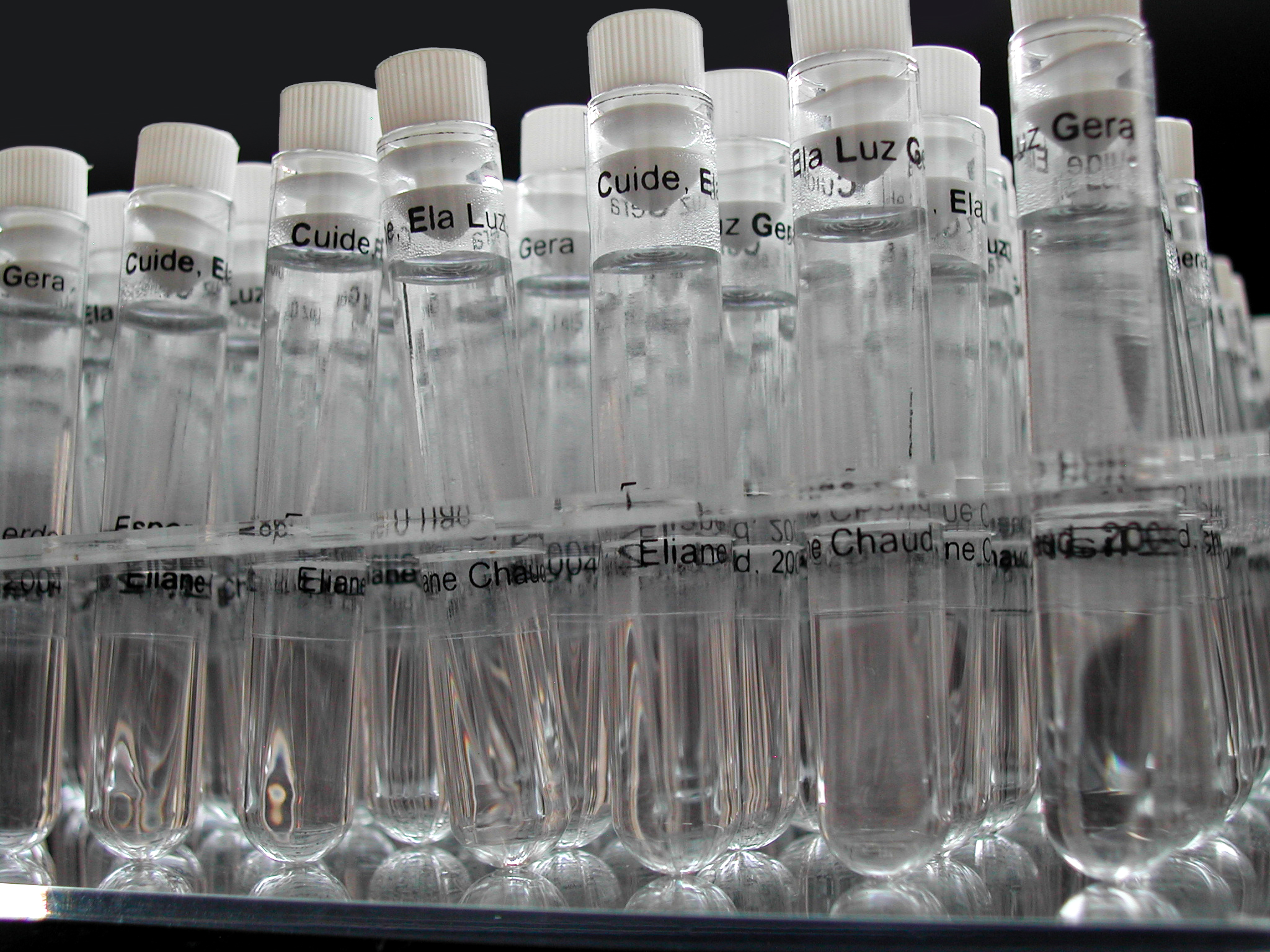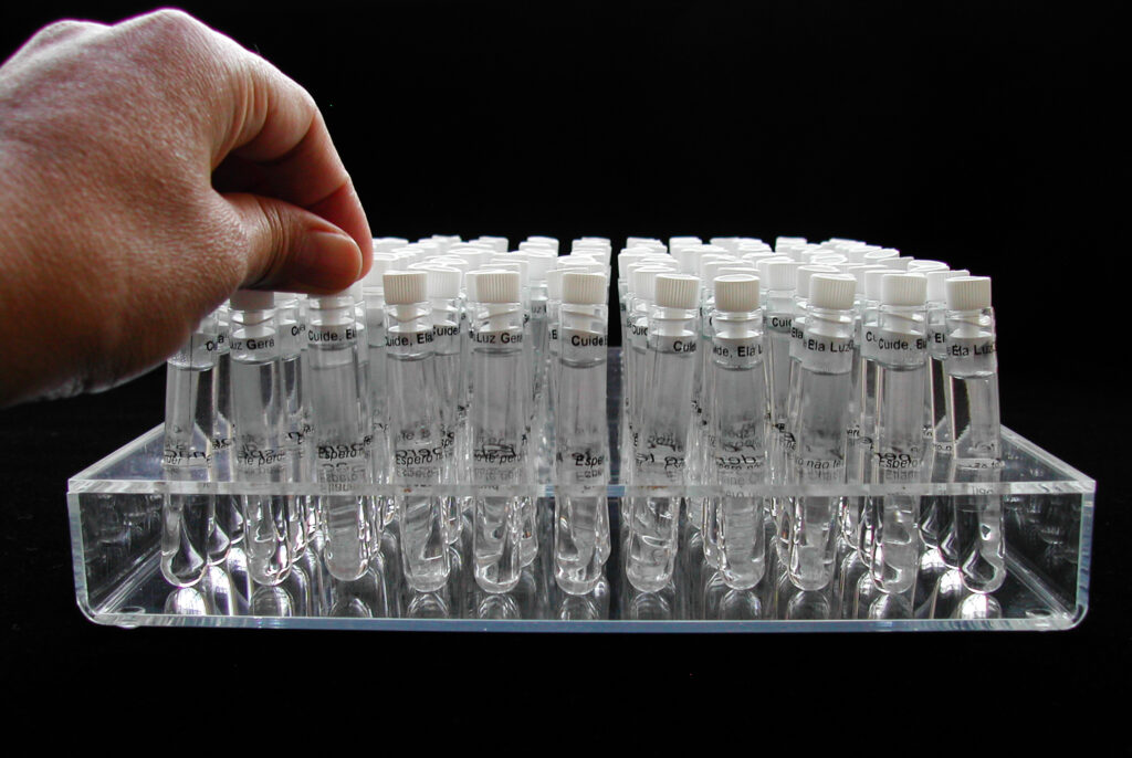 Eliane Chaud. Espero não te perder (2004), Tubos de ensaio, água, acrílico. Dimensão: 8x25x25 cm.