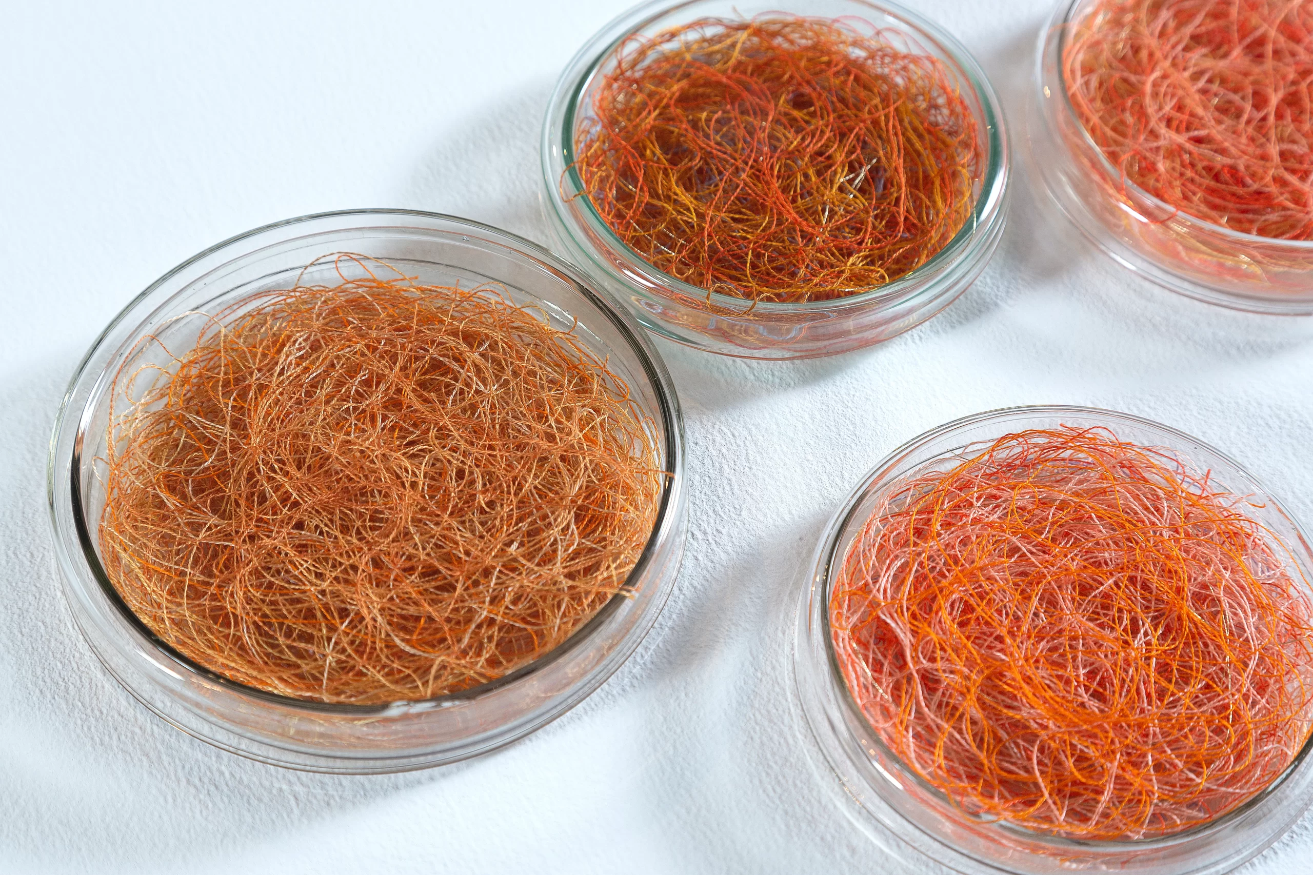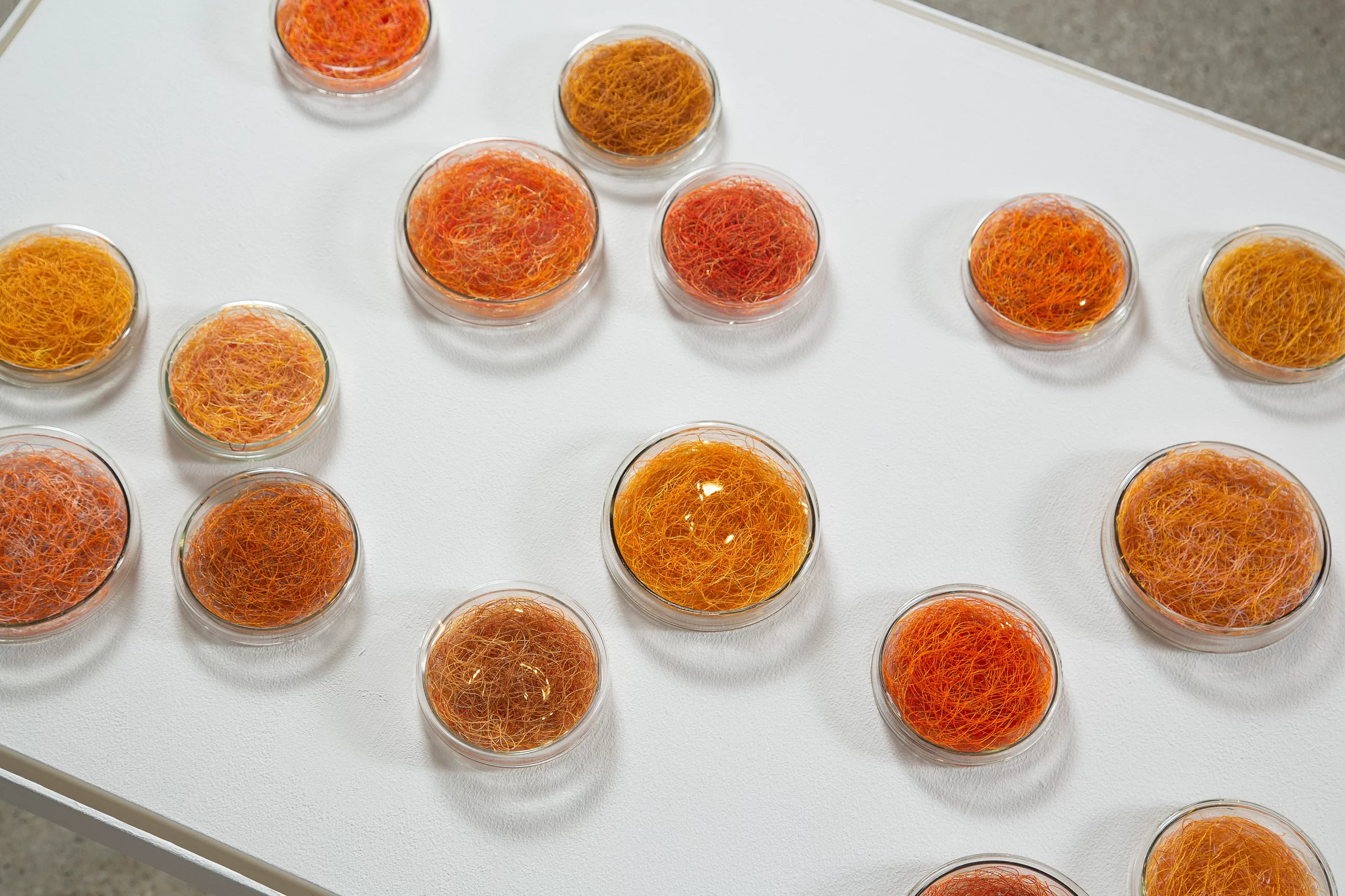 Linhas de costura de várias tonalidades organizadas em Placas de Petri (10 a 12 cm cada), dispostas sobre mesa, dimensões variadas.