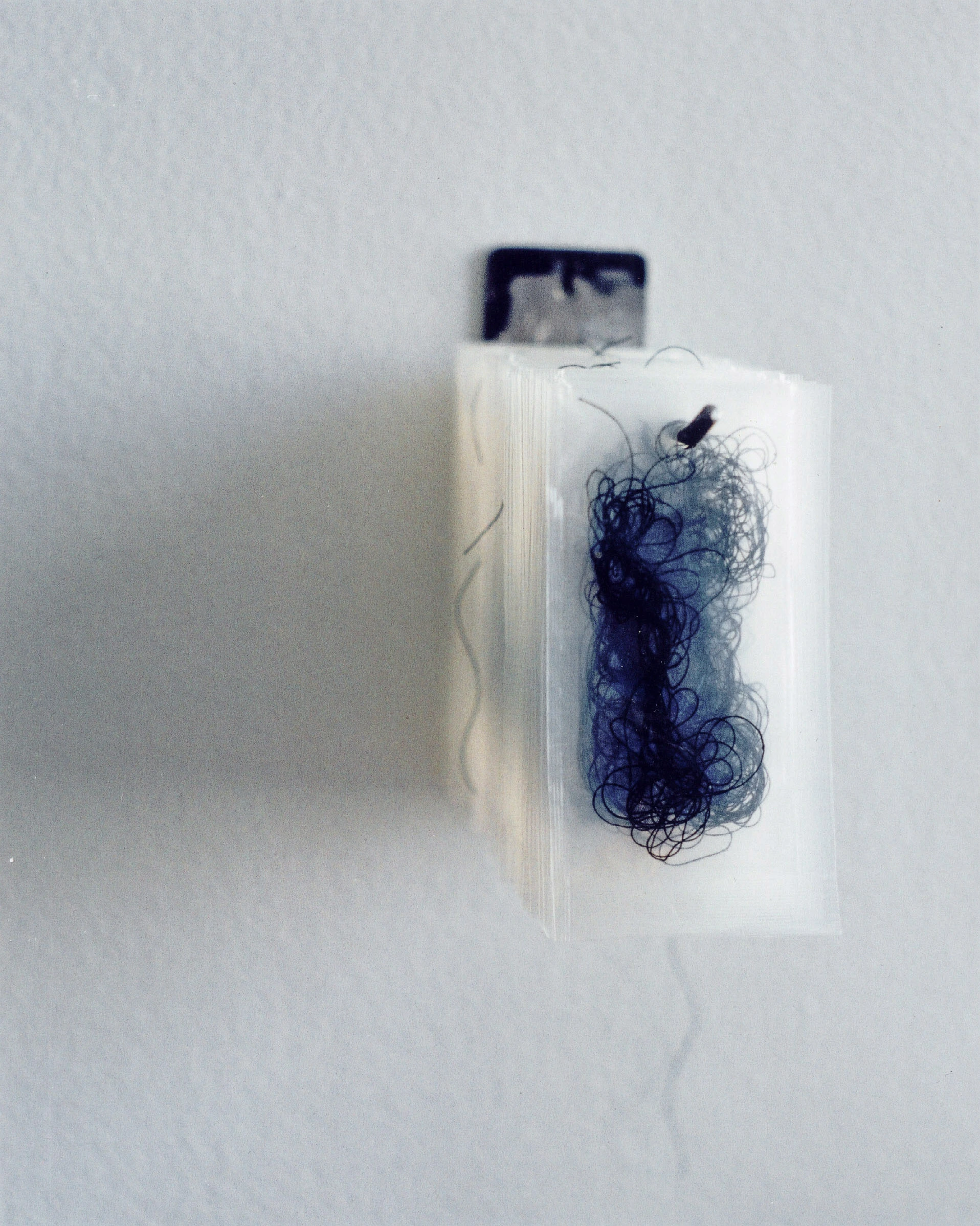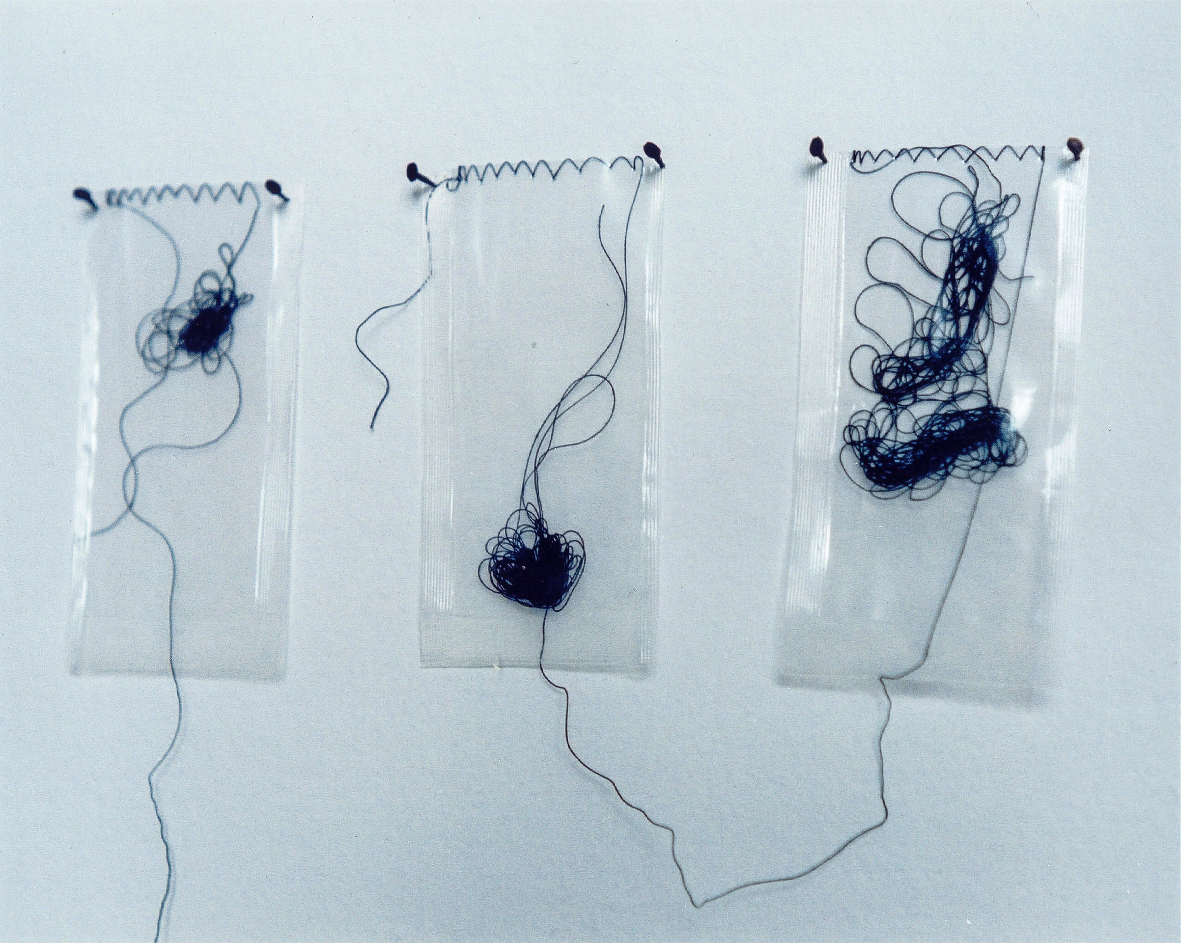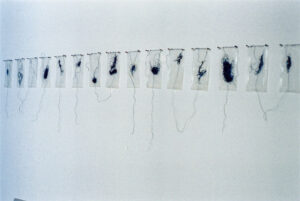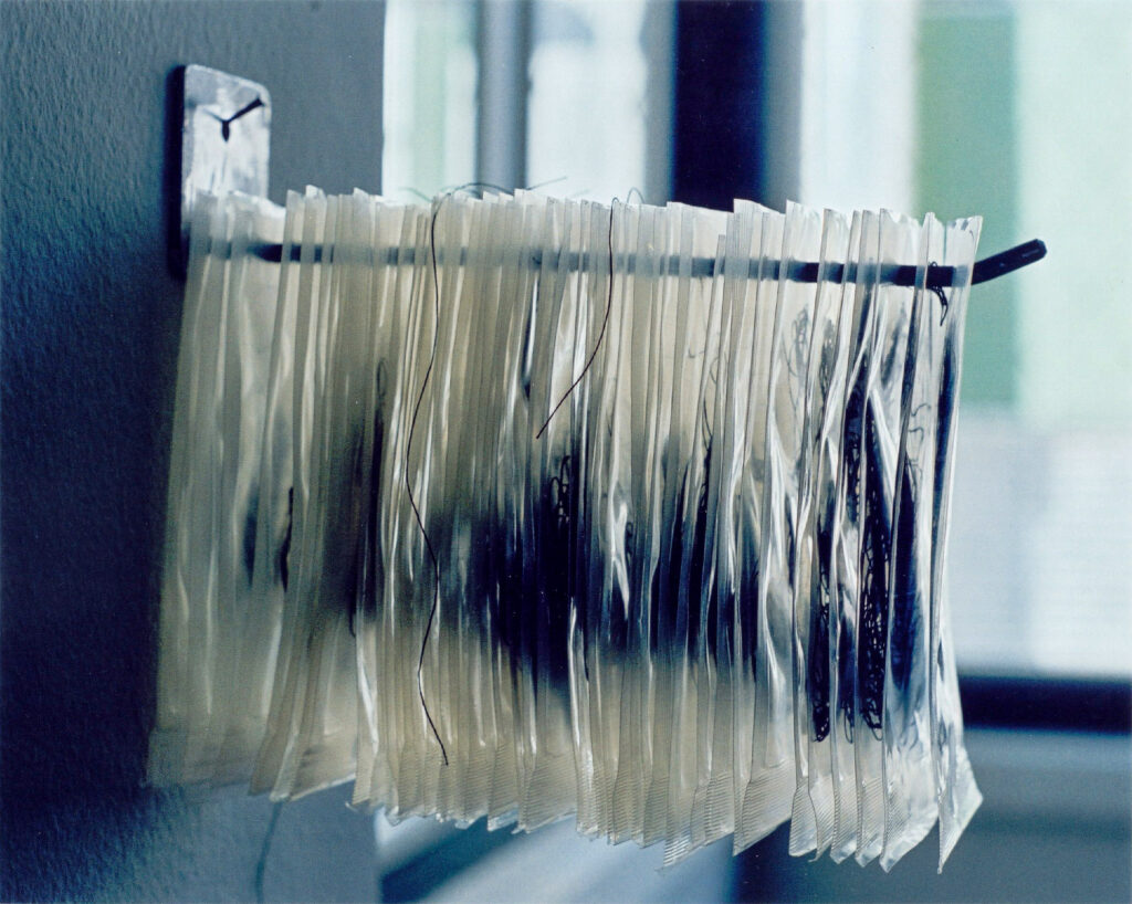 Eliane Chaud, Que seja o que você quiser (2001). Saches de plástico com linha de costura e suporte de metal. Dimensão: 12 x 6 x 17 cm. Acervo Pessoal.